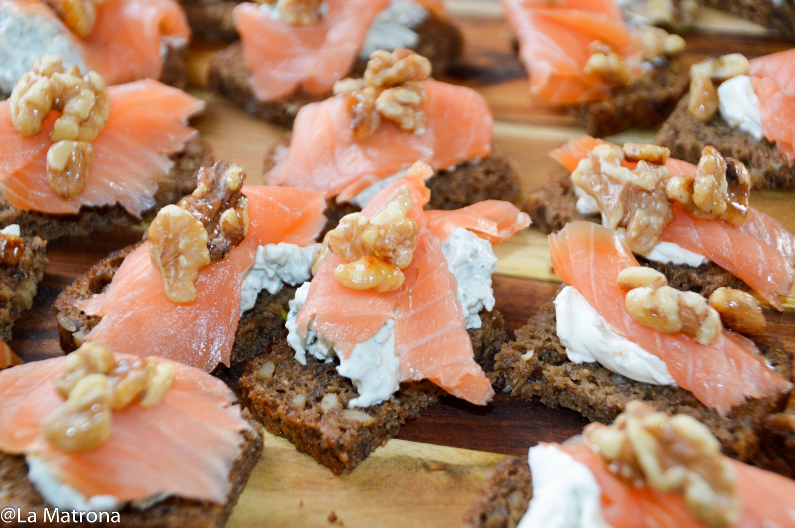 Gör så här: Dela rågbrödet i fyra delar. Rör i hop crème fraiche med grönmögelost och dra några varv på pepparkvarnen. Rosta valnötterna i varm panna, ringla över honung på slutet. Klicka därefter på en bit ädelostcréme på rågbrödet, lägg sedan på en bit lax för att slutligen toppa rågbrödet med de honungsrostade valnötterna.