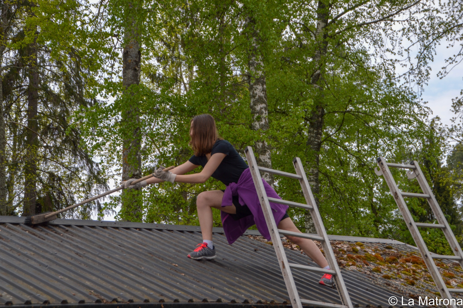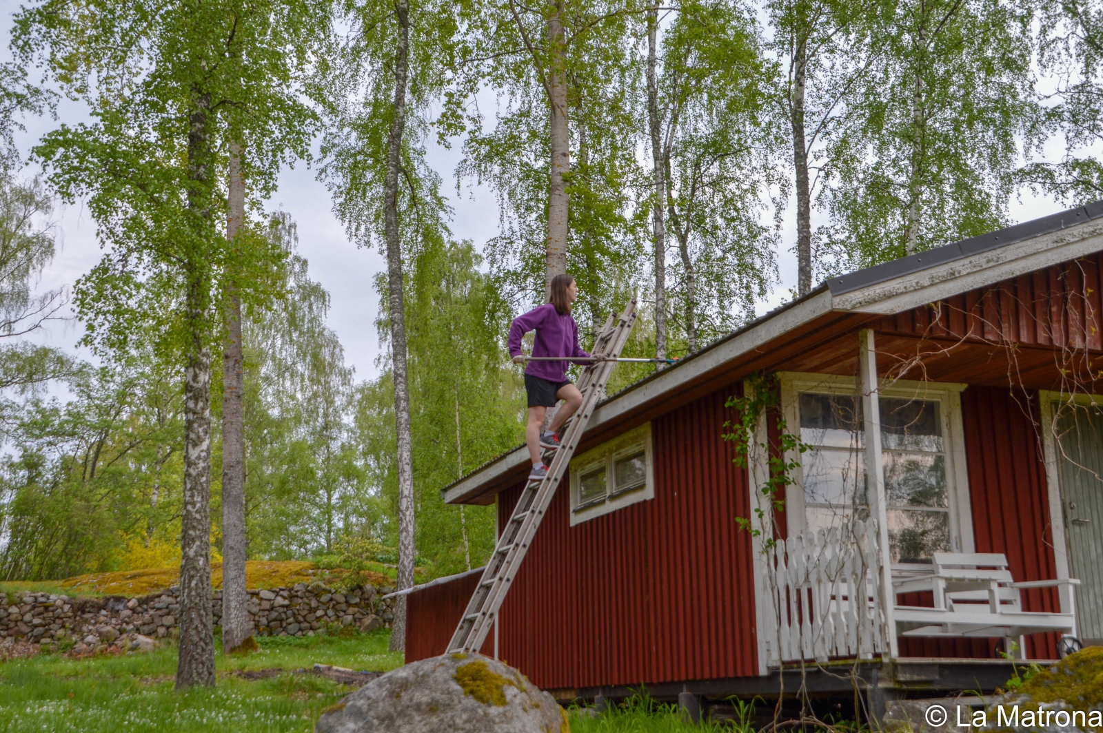Vi tog en tur med båten för att kompletteringshandla på affären mitt över fjärden. Det var kav lugnt på sjön och alldeles tyst. När jag lugn och avslappnad kom tillbaka till ön kastade sig Corinne upp på gäststugans taknock och satte igång att städa bort alla löv och mossbitar på taket.