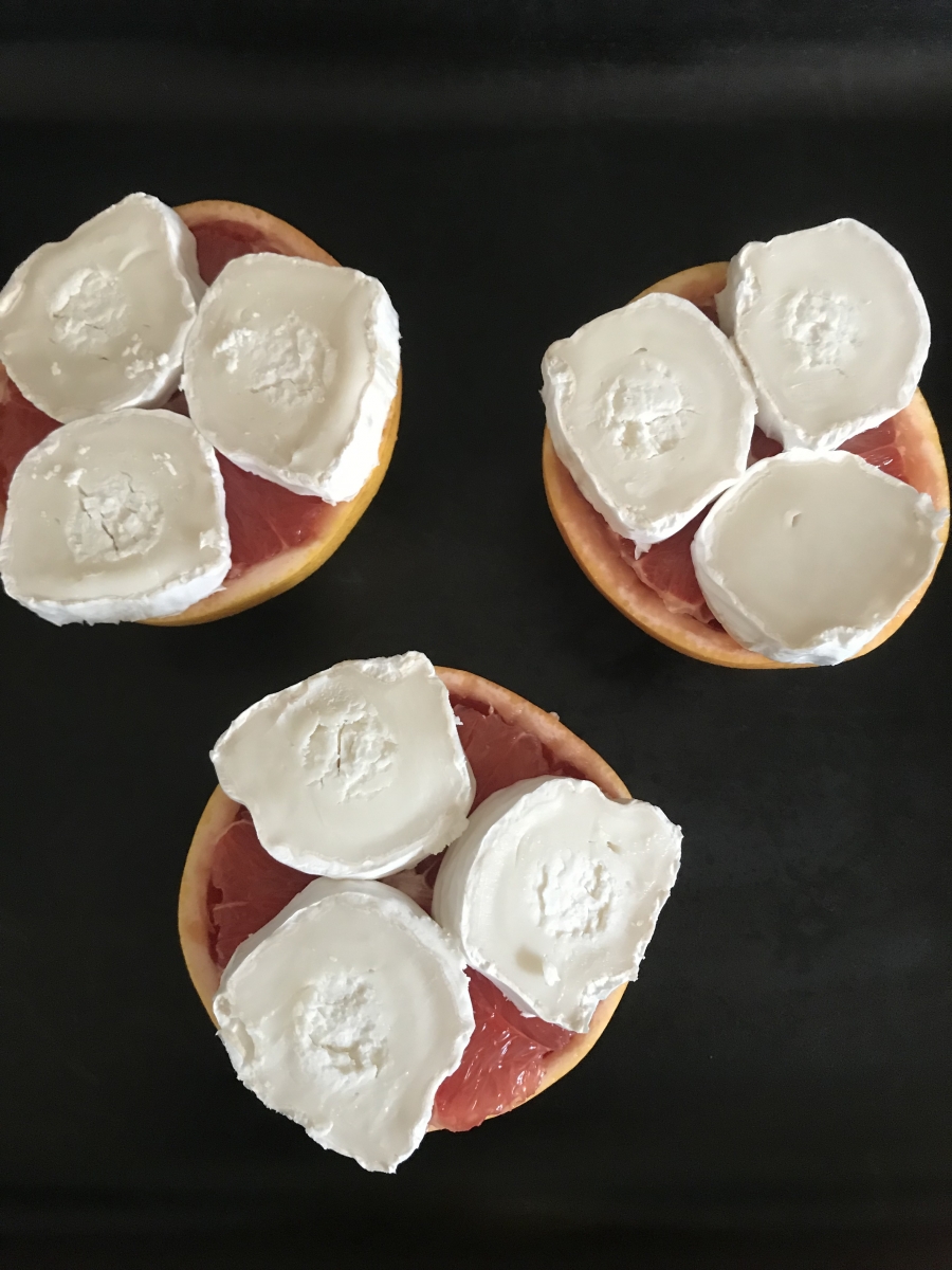 Gör så här: Sätt ugnen på 250 grader. Dela grapefrukten och skär loss fruktköttet från skalet men lämna kvar fruktköttet i skalet. Skiva getosten i tre delar och lägg på skivorna uppe på grapefrukten.Gratinera högt upp i ugnen tills osten har smält och fått fin färg. Servera med honung och pinjenötter/ solrosfrön.