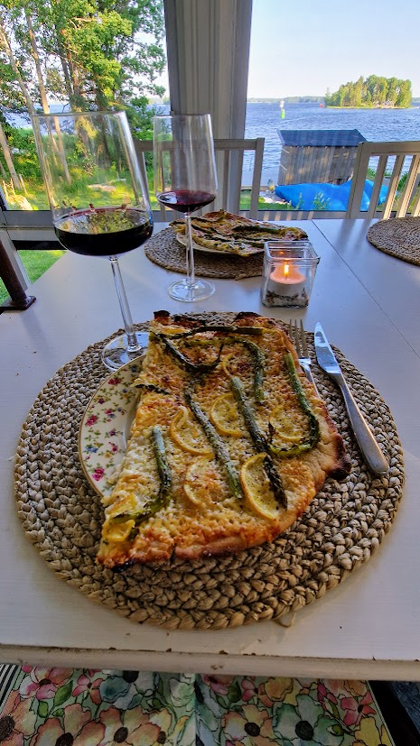 För flera år sedan fick Patric en pizzasten i present av barnen, den har använts en endaste misslyckad gång innan denna helg. Som tur var kunde Simon lära oss hur det ska gå till. Men innan pizzafixet åt vi en rackarns god skagenförrätt, med nyckelpigevin till.