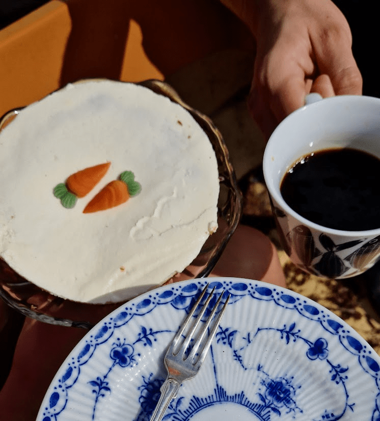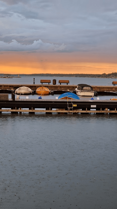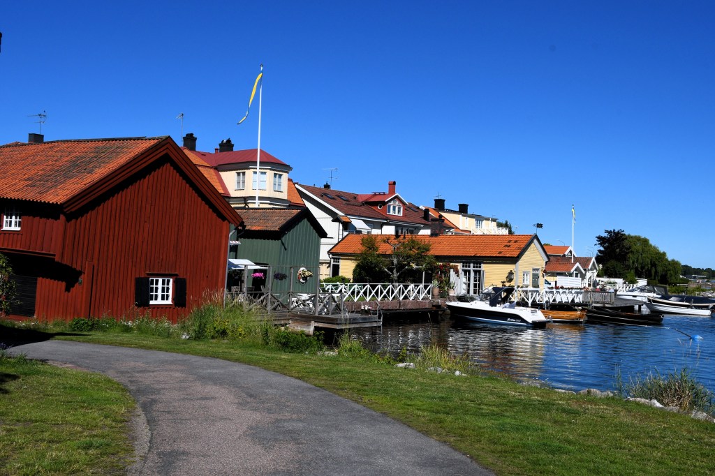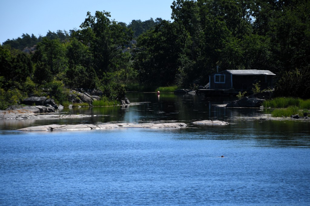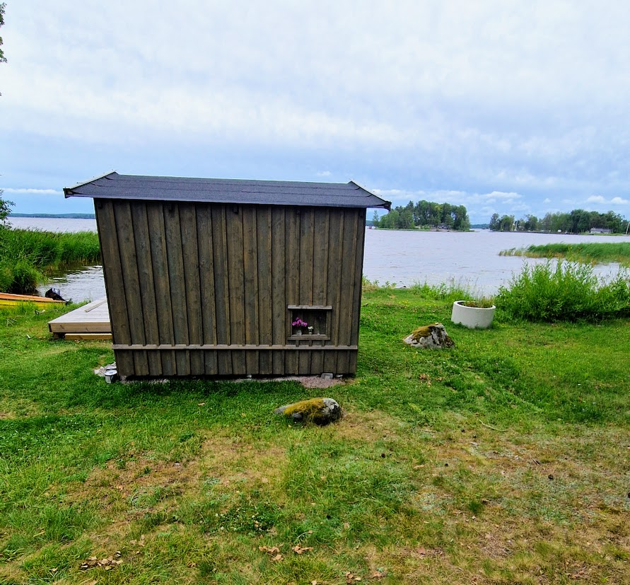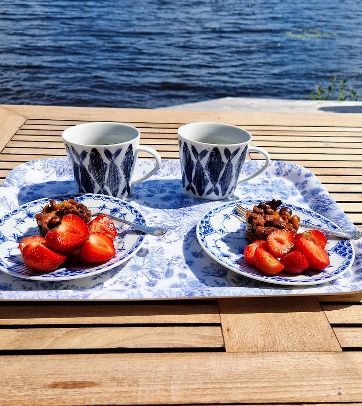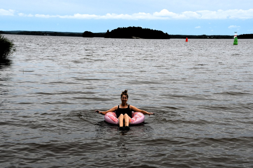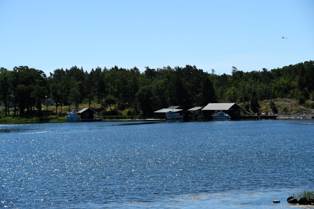 Man skulle kunna tro att det skulle fläkta lite på sjön, men nej då, det var knappt en vinpust när vi susade ut med Gula faran. Vi stannade till på ett skuggigt men mysigt ställe och fikade i båten, morotskaka och kaffe, mums!
