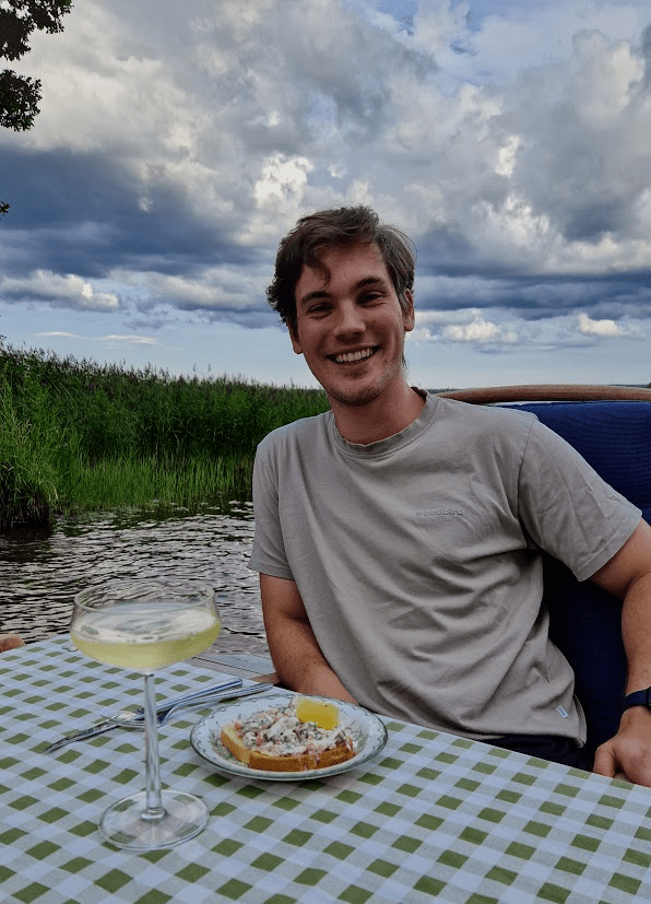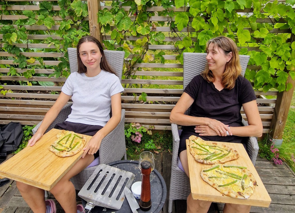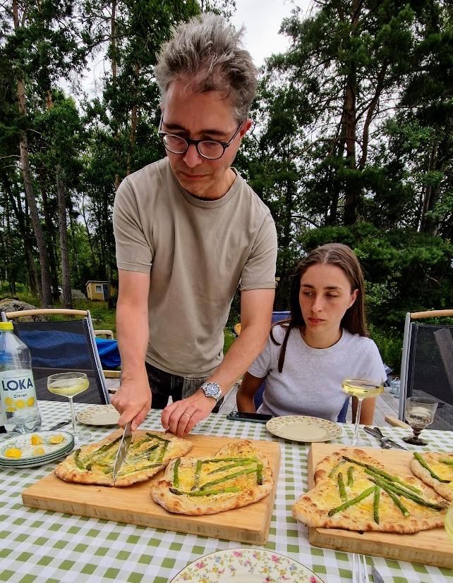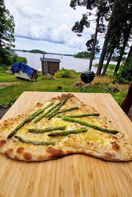 Att laga pizza på sten var himla kul, alla hade sina positioner runt grillen. Corinne penslade på gräddfilen, Simon västerbottenosten, Patric slängde på citronerna och Corinne avslutade med sparrisen. De behövde vara väldigt effektiva och snabba, vilket de var, förutom det var det stekhett runt stenen.