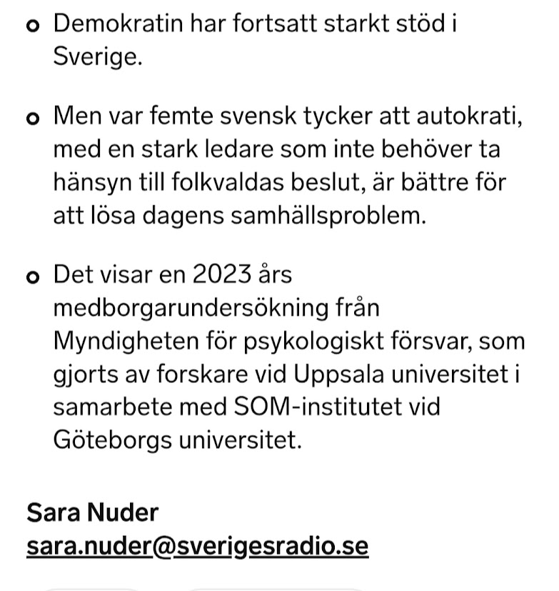 Varje morgon, innan jag sätter tänderna i tidningen, stålsätter jag mig. Hur dåliga nyheter kommer jag att få tugga i mig? Jag läser om Trumps senaste presidentorder, och magen knyter sig. När ska hans väljare börja ifrågasätta sitt val – eller kommer de bara att fortsätta hylla varje steg han tar? Och det här med Grönland… Hur reagerar det amerikanska folket? Tycker de verkligen att det är rimligt att militären används för att ta över ett annat land, ett land de inte ens har rätt till? Jag läser om Gaza och om hur kriget går i Ukraina, fortsätter vidare till Sverige, och om upptappningen av alla sprängningar runt om i Stockholm, Malmö, Göteborg med fler. Barnsoldater som står i kö för att ta på sig alla dessa uppdrag utan att inse konsekvenserna av sitt handlande. Näe, just nu får man leta länge innan man finner en ljusglimt i mörkret, men vi får inte ge upp! Glöm inte hur viktig du är för demokratin!