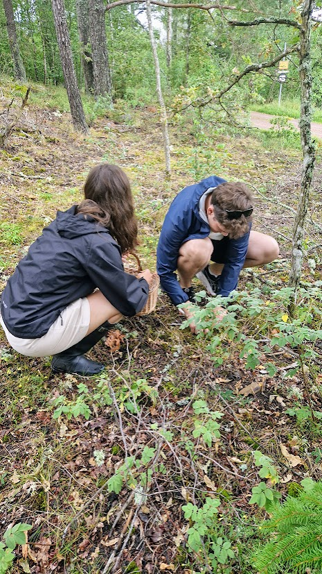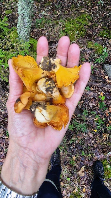 Mitt i min ensamhet här på landet kom Corinne och Simon ut som två glada överaskningar i spöregnet, jag blev så glad. De hade just kommit hem från en vecka på Sicilien, solbrända och proppmätta på pasta och pizza. Simon ville genast gå på kantarelljakt, självklart, sa vi och tryckte på oss regnjacka och gummistövlar.
