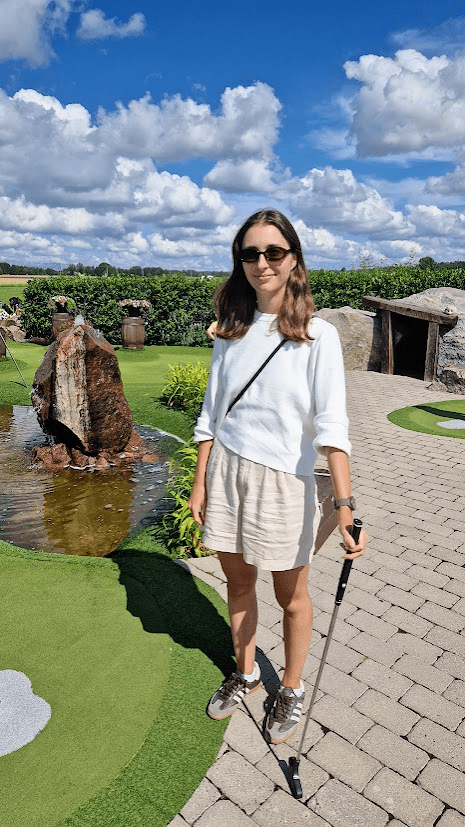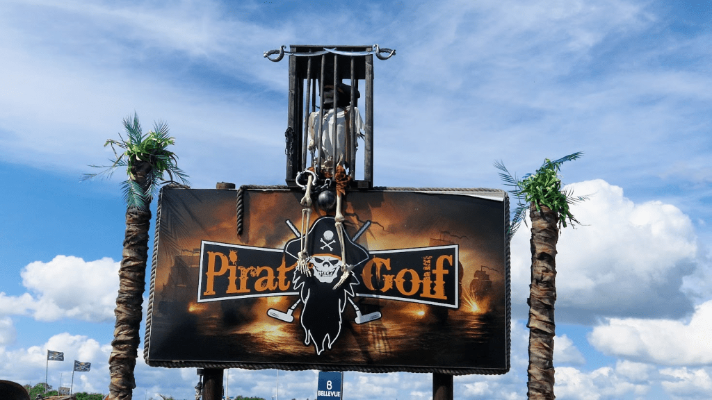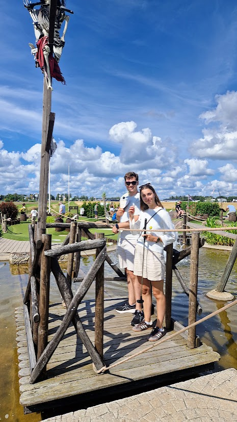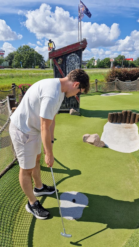 På minigolfbanan tog det hela en oväntad vändning, för att komma till nästa hål var man tvungen att ta sig över vattnet med hjälp av en liten flotte. Det kändes mer som ett inslag från ”Expedition Robinson”. Allt som saknades var en dramatisk speakerröst och en kokosnöt.