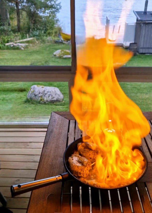 Patric har fixat med elen och snart är det dags att hoppa in i bastun. I kväll väntar grillning och ett gott rött vin, jag längtar redan.