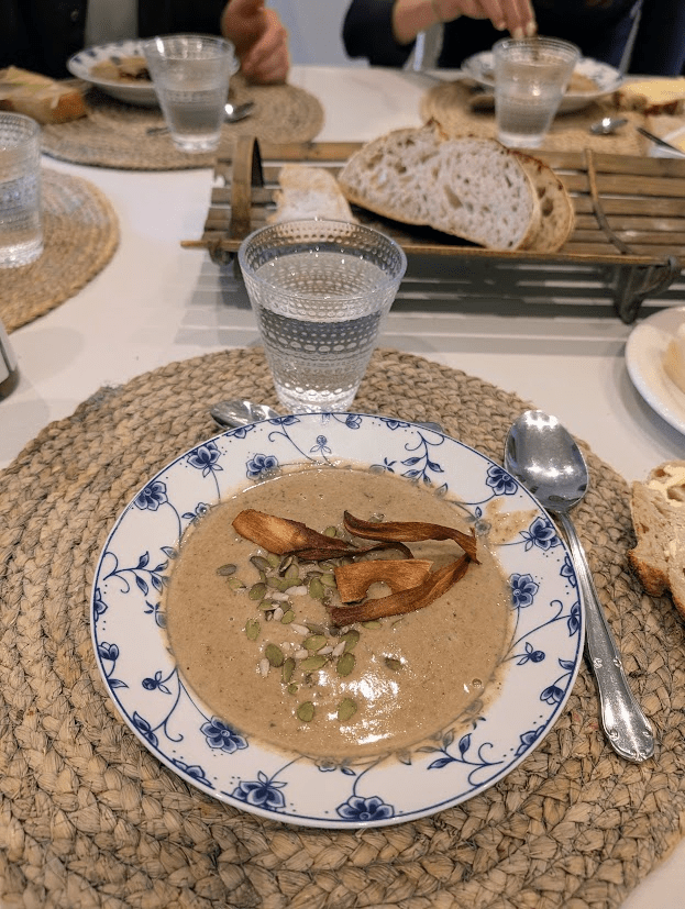 Patric stod för middagen och lagade en champinjonsoppa, toppad med friterade rotfrukter. Som avslutning strödde vi över solros- och pumpafrön, vilket gav både smak och härlig crunch.