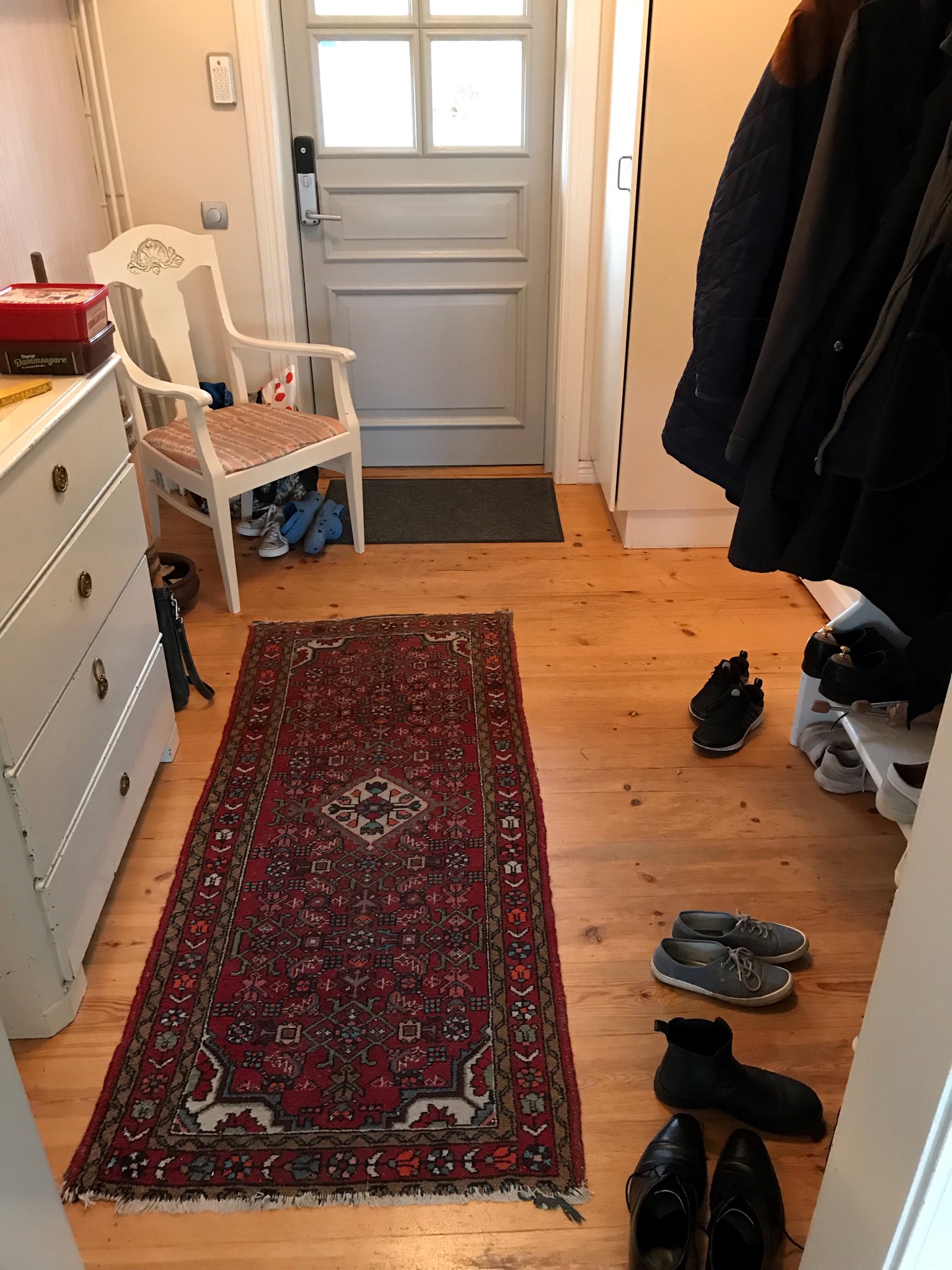 Färgen jag målade med heter Sunborn och jag älskar den gråblå färgen. Sänggavlarna köpte jag för ett par år sedan på loppis för 75 kronor. Då såg det inte roliga ut, en ful furuhistoria. Lacken satt som pansar och var jättesvår att få bort, men det var det värt. Jag tycker detaljerna i gavlarna är vackra.
